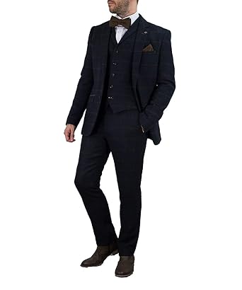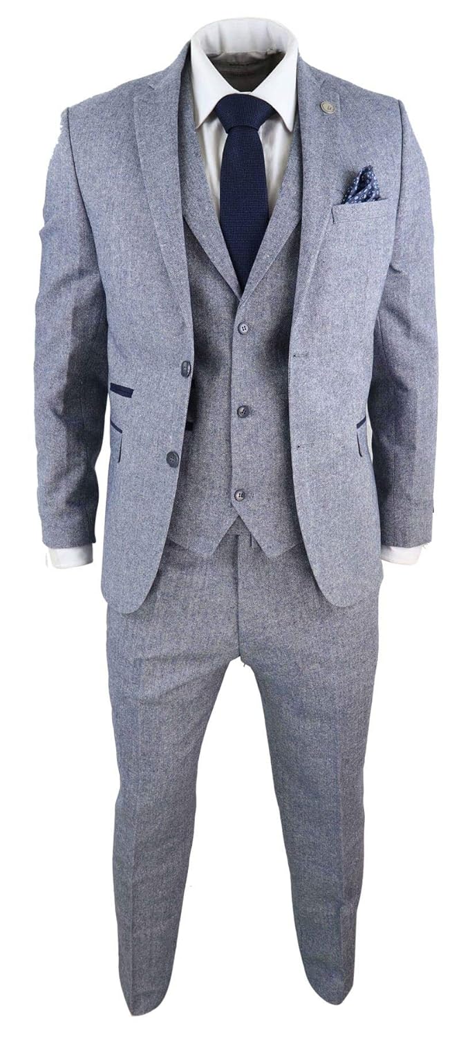 Costume Homme Laine Mélangée 3 Pièces Tweed Bleu Gris Bleu Marine