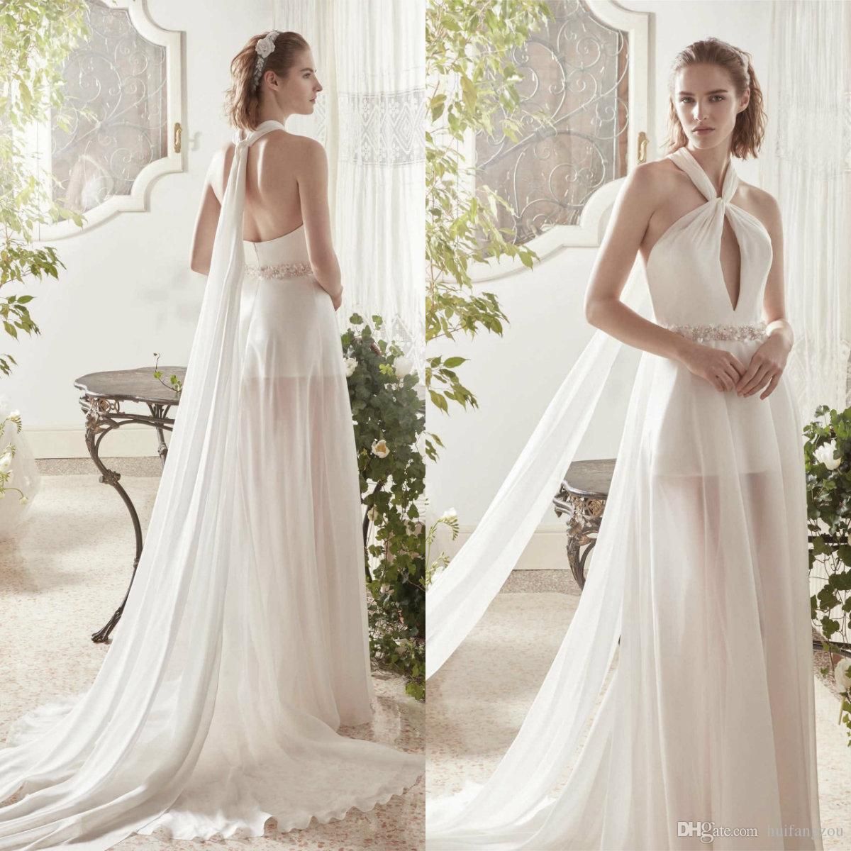 Discount 2019 Summer Chiffon Wedding Dresses Halter Neck Key Hole Design Backless Bridal Gowns With Crystal Beaded Belt Wedding Dress Uk Wedding