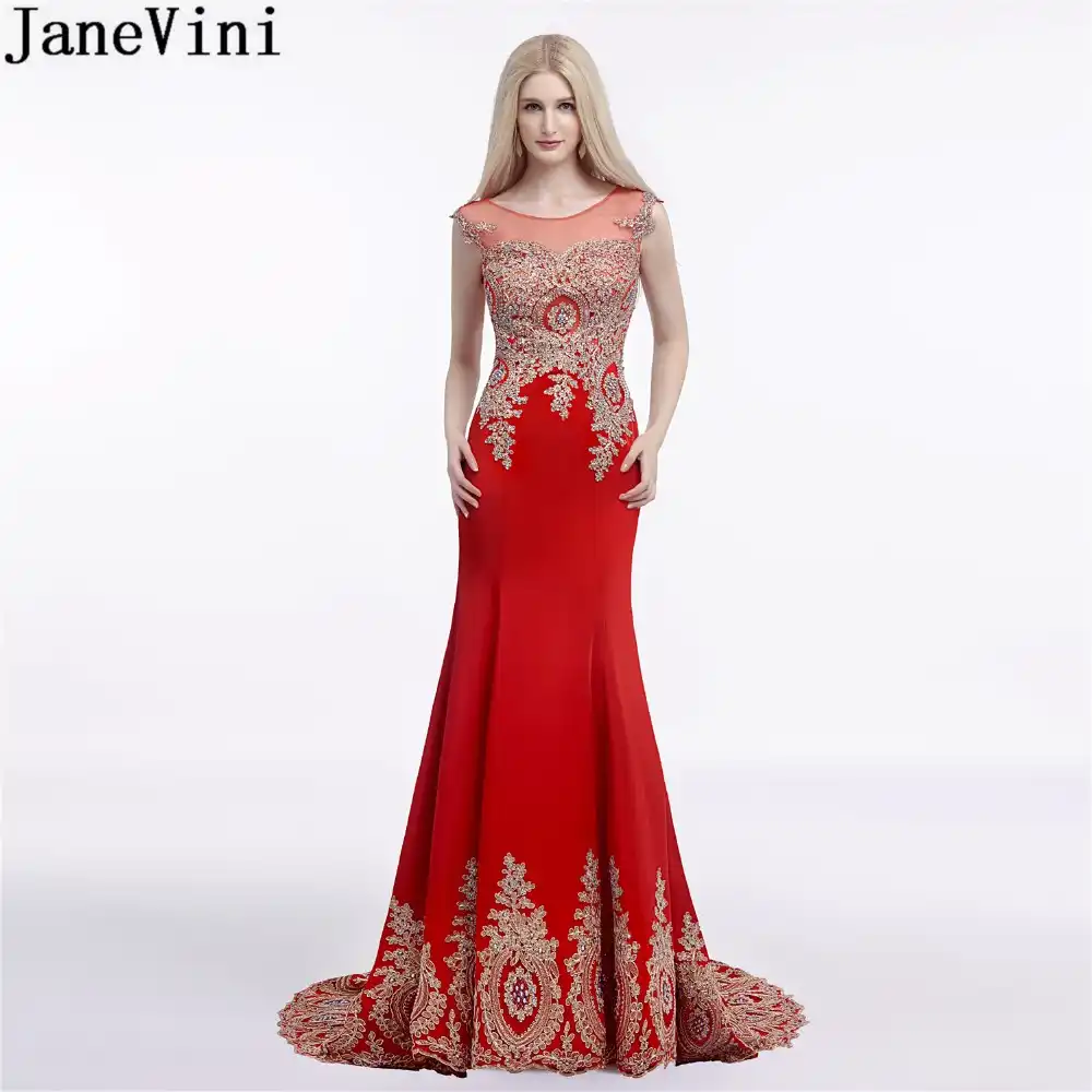 Janevini Elegant Red Wedding Party Dresses Plus Size Gold Lace Long Mermaid Bridesmaid Dress Beaded Illusion Satin Formal Gowns