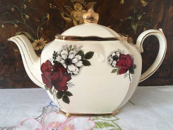 Sadler Cube English Teapot With Burgundy Red And White Rose Pattern Finished With Gold Detailing