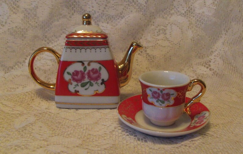 Vintage Imperial Porcelain Miniature 4pc Tea Set Red Gold Pink Roses Teapot 3 1 2 Tall Teapot Collectible Doll Bear Size
