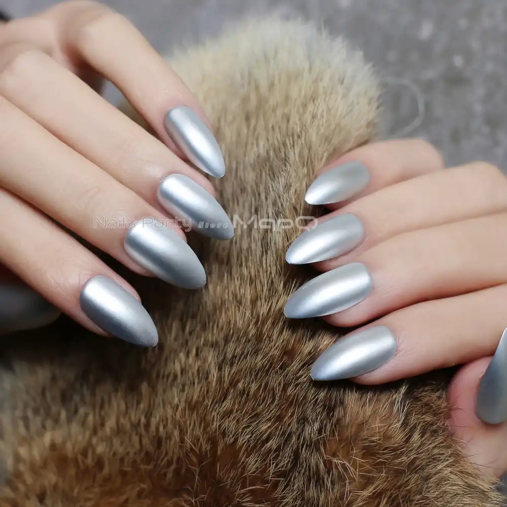 New Silver Matte Metal Stiletto Nails Red Medium Cool Fake Nails